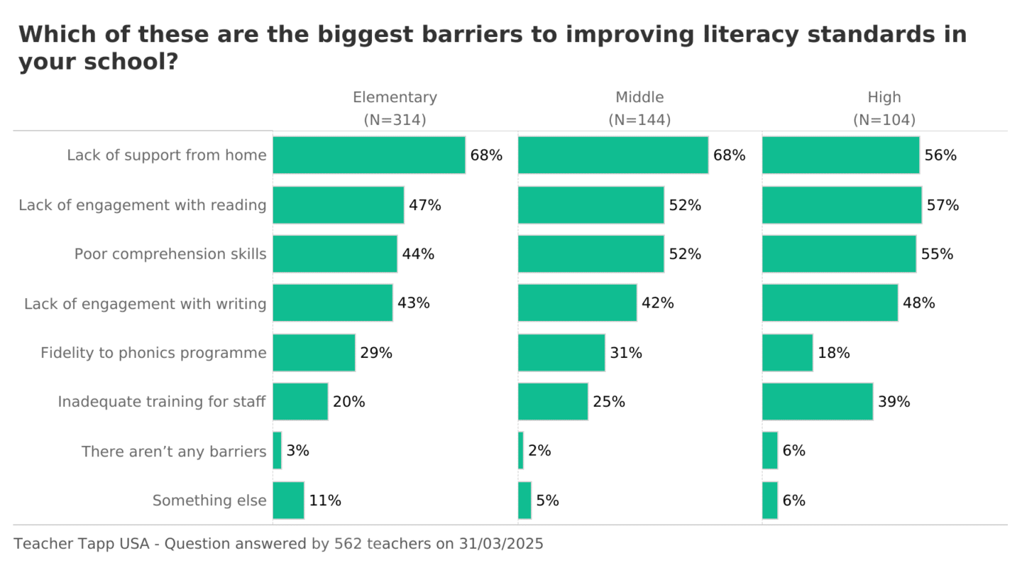 In high schools, lack of home support, low reading engagement and poor comprehension skills were picked out as barriers by more than half the teachers (56%, 57% and 55%).