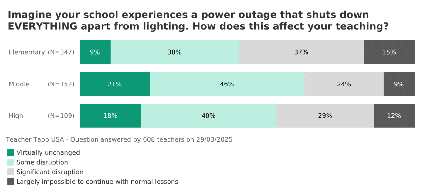 More than half of elementary teachers (52%) say a power outage would lead to significant disruption or that it would be largely impossible to continue with normal lessons. The same is true for a third of middle school teachers (33%), and 41% of high school teachers.