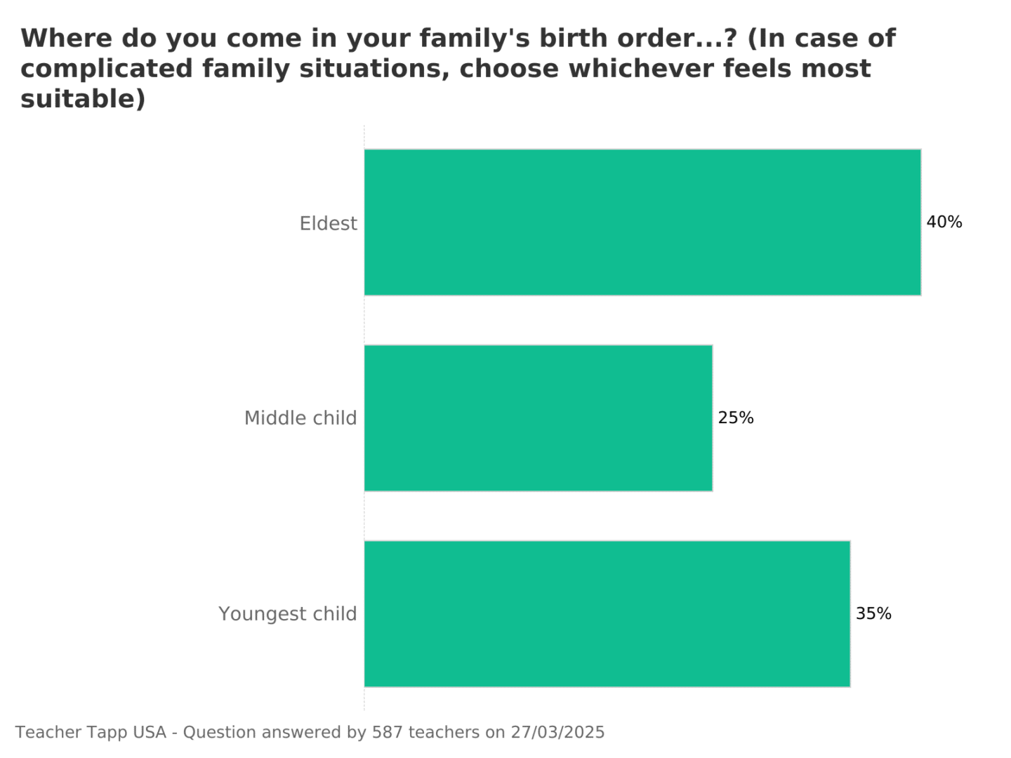 Just 9% of teachers are only children which, according to this article is lower than the US average of 20%. Of those who do have siblings, though, is there any link between birth order and becoming a teacher?