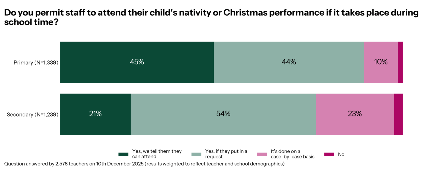 Primary leaders are more likely than secondary leaders to tell their teacher-parents they can attend their son or daughter’s nativity or Christmas performance (45% vs 21%). Even if not many secondary leaders are telling teachers explicitly that they can attend their child’s Christmas show, 54% of secondary say yes if a teacher puts in a request, but 23% will take each one on a case-by-case basis. In primaries, 44% will give an automatic yes if the teacher asks, and just 10% consider it case-by-case. 1% of primaries don’t allow teachers to attend nativity or Christmas shows, and the same is true for 2% of secondaries.