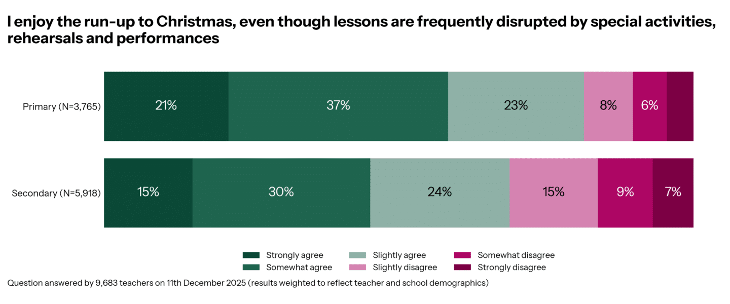Overall, primary teachers feel they gain more than the pain, with 81% agreeing they enjoy the run-up to Christmas; most secondary teachers also agree, just not as strongly ( 69%).