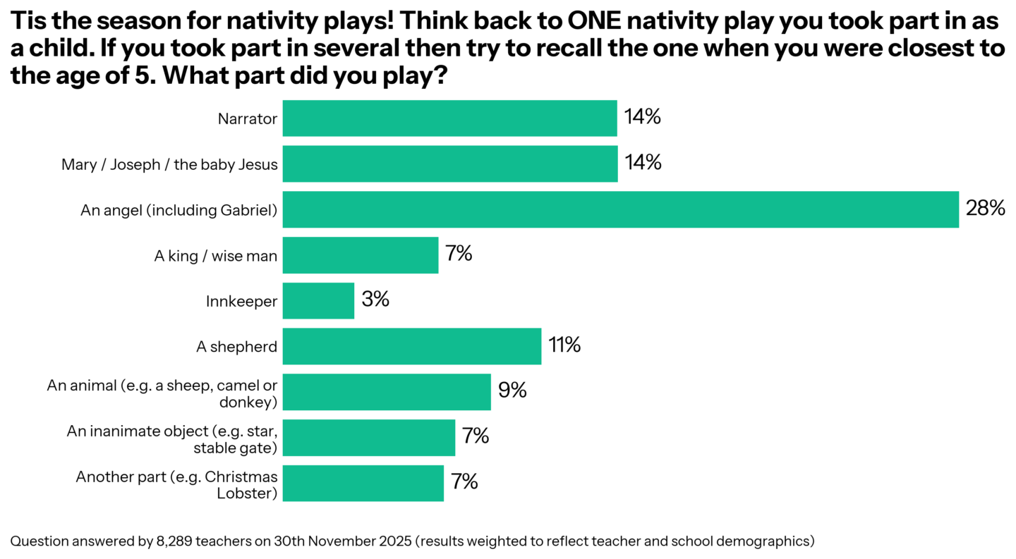 Once upon a time, of course, teachers were small, excitable children on stage and performing. But what part is a teacher most likely to play? 16% can’t remember, but among those who do: 28% of teachers played angels, 14% were the narrator, and 14% had a starring role of Mary, Joseph or the baby Jesus.