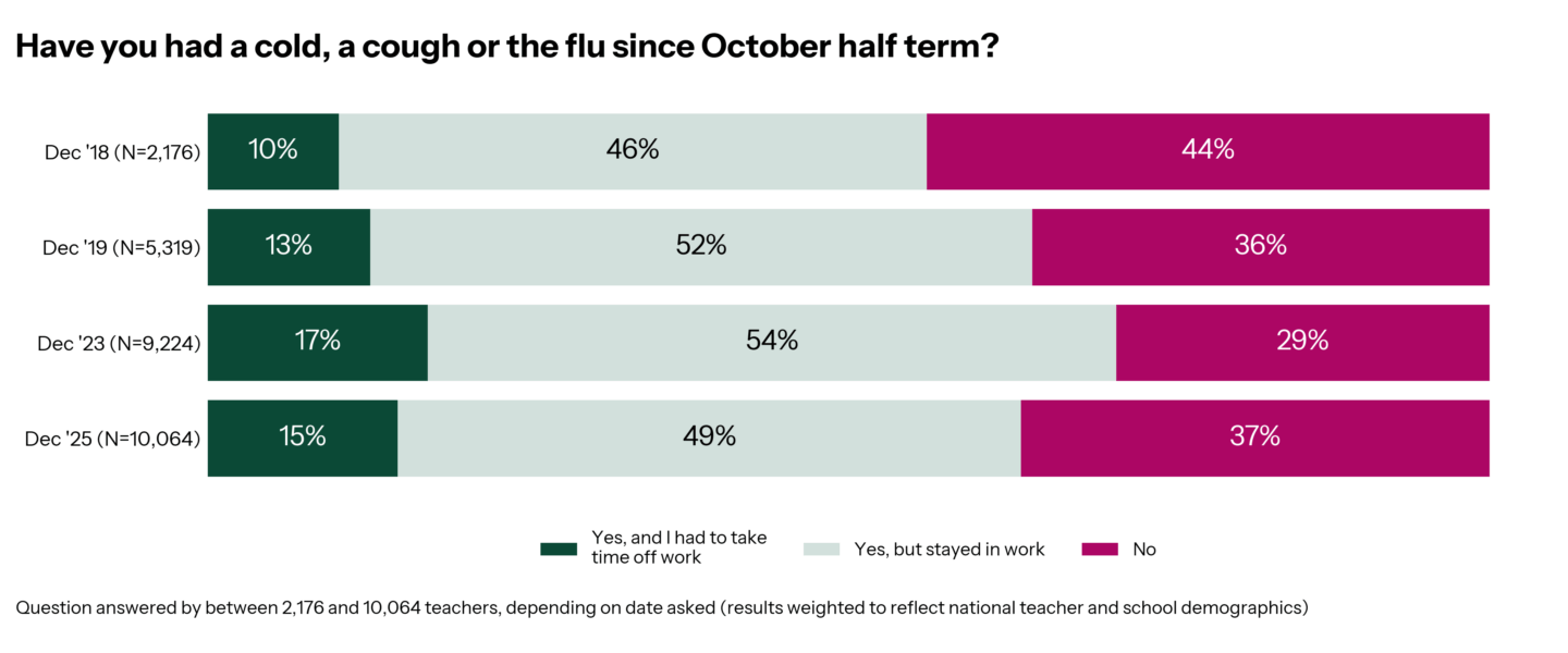 This year, 17% of secondary teachers have taken time off due to colds, coughs, or flu, compared to 13% of primary teachers. In 2018, primary and secondary schools reported similar levels of absence (9% and 10%, respectively).