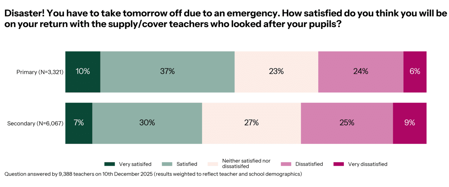 Of course, the tricky thing as a teacher when you take time off is that your students are still there, and your workload can actually increase if you are still expected to set the work. More secondary teachers than primary teachers say they would feel ‘dissatisfied’ with the cover given to their class (34% vs 30%).