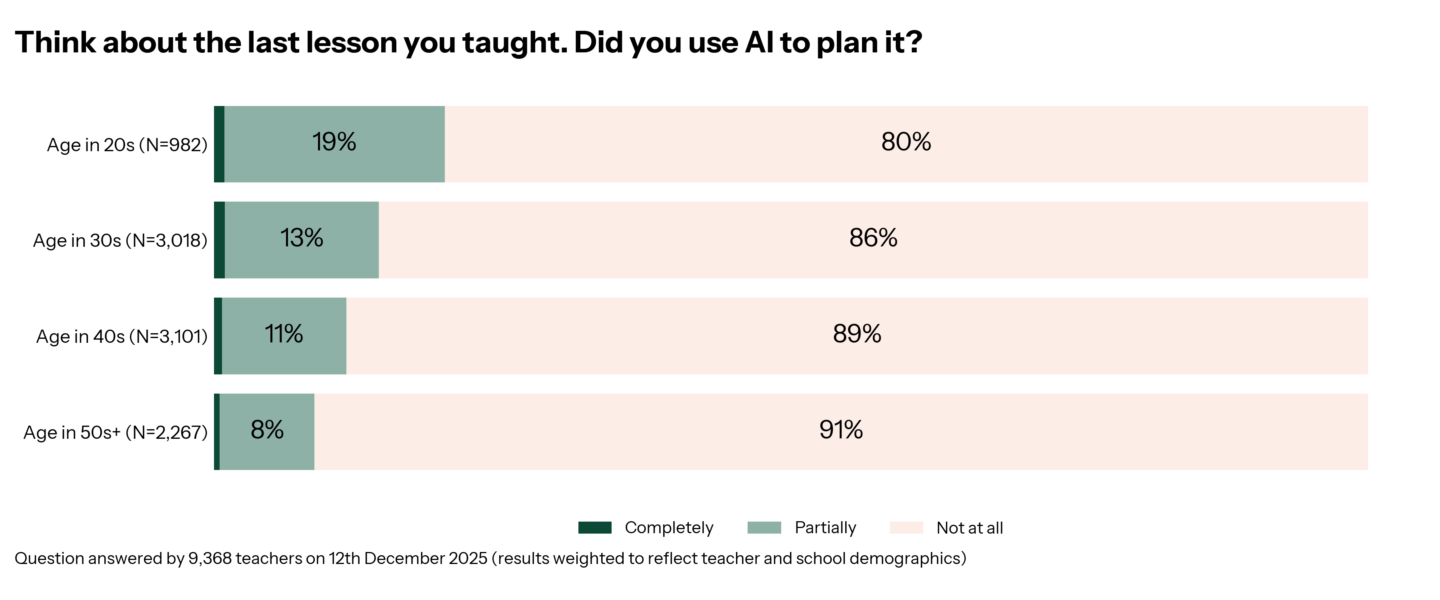 The answer might depend on the age of the teacher. 20% of teachers in their 20s used AI to plan their last lesson, but the same is true for just 9% of teachers 50 or over.