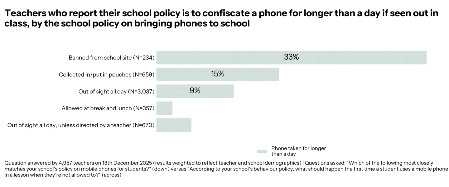 When we look at the policy for confiscation, teachers in schools that take phones until the end of the day, 3% had a phone out in the last lesson, compared to 12% in schools where the phone is taken until the end of the day, and 25% where a verbal warning is given.