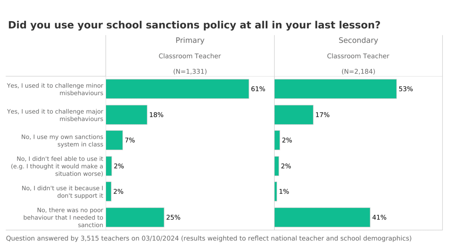 Primary classroom teachers are more likely to use the school sanctions policy to challenge minor misbehaviours than secondary classroom teachers (61% vs 53%).