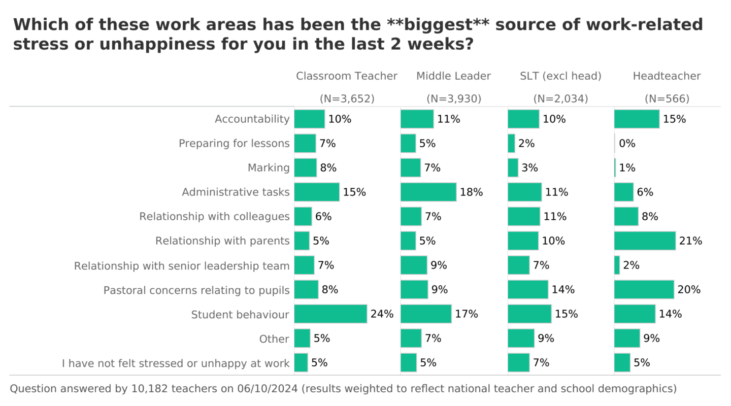 Student behaviour was the number one cause of stress for classroom teachers (24%) followed by admin tasks (15%) and then accountability (10%).