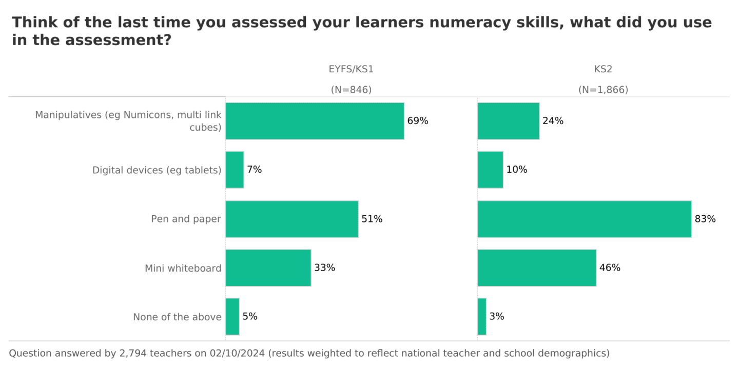 In EYFS and KS1, they’re most likely to involve manipulatives like Numicons or multilink cubes (69%), whereas in KS2 they’re most likely to use pen and paper (83%).
