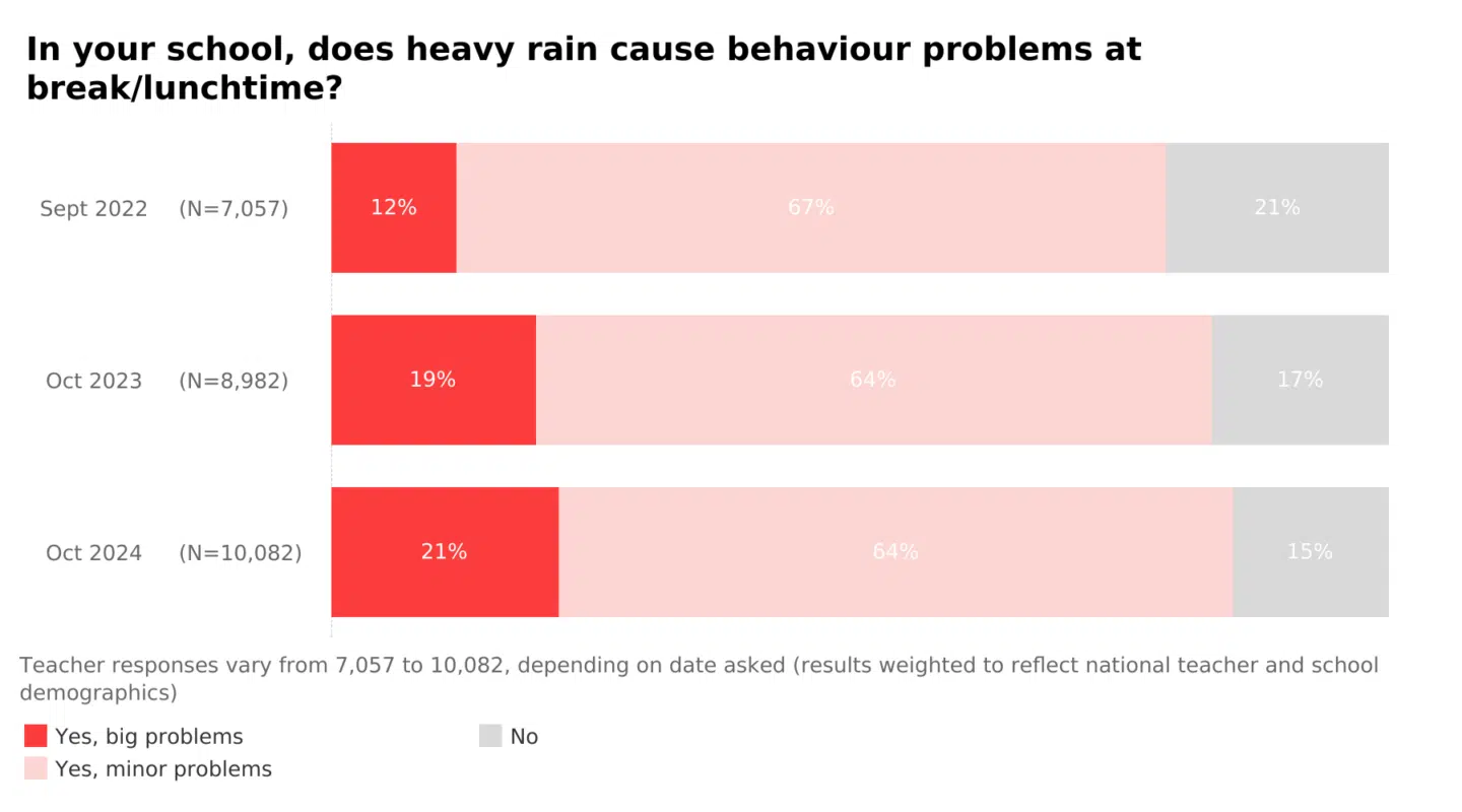 Perhaps the awful weather has contributed to some of the poor behaviour above (maybe the Teacher Tapp umbrellas would help…) as heavy rain leads to behaviour problems at break and lunch in 85% of schools.