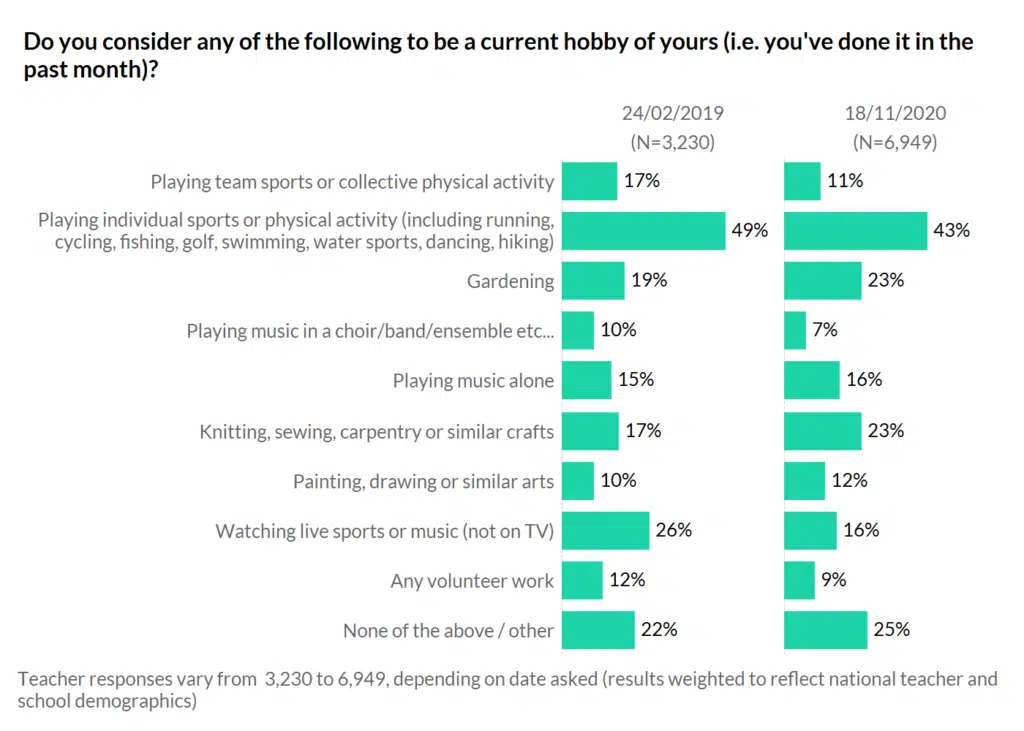 What are you looking forward to doing when the world opens up again? There has been a fall in the number of you who have been able to do your hobbies recently – whether team sports or other physical activity or playing music. We had wondered whether there would have been a rise in hobbies that are currently possible. There has been a small rise in gardening as a hobby (from 19% to 23%) and a rise in knitting/carpentry and other crafts (17% to 23%). But alas, little change in music making alone. What will you carry on doing when the world opens up again?