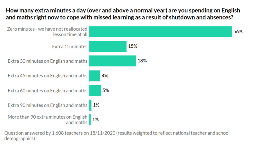 Still, over half say they aren’t devoting extra time to English and maths. (I wonder how they ever manage to catch up, given they are returning to last year’s topics?) Most of the rest are adding an extra 15 or 30 minutes of English and maths each day.