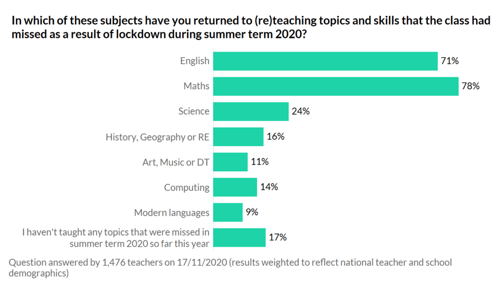 Whilst back in primary school, there is a quite a bit more English and maths teaching going on. Most primary teachers are having to cover topics that should have been taught last summer term in these two subjects. It is worth noting that most other subjects are not being returned to, so students who missed out on the Romans or the Anglo Saxons will never….{can’t finish this sentence}!