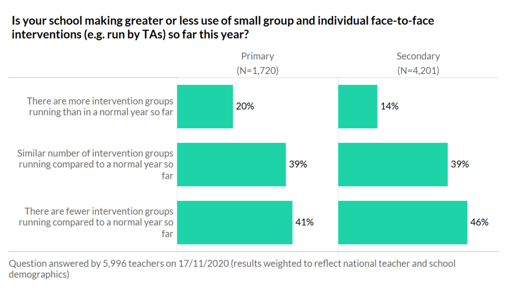 What’s strange so far is that, despite learning loss, there are FEWER intervention groups taking place in school this year. We didn’t ask why, but assume the need to avoid cross-bubble missing of students and staff and the need to cope with staff absences means that many TA small-group interventions have had to be abandoned.