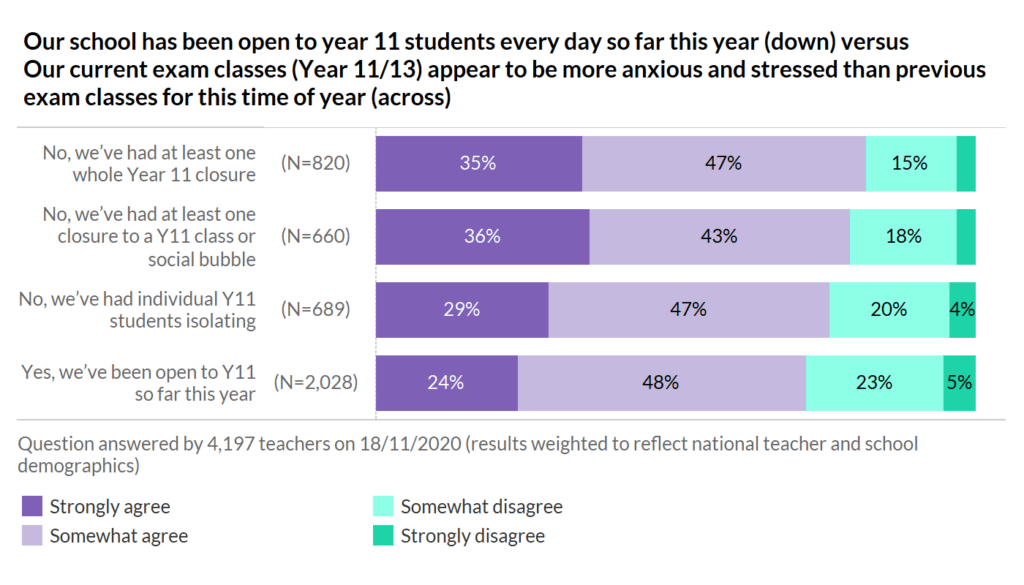 We asked whether current exam classes appeared to be more anxious and stress than in previous years – three quarters of teachers felt that they did. Perhaps not surprisingly, when we look at whether this is related to Year 11 closures we find that schools with Year 11 closures are more likely say their students are stressed.