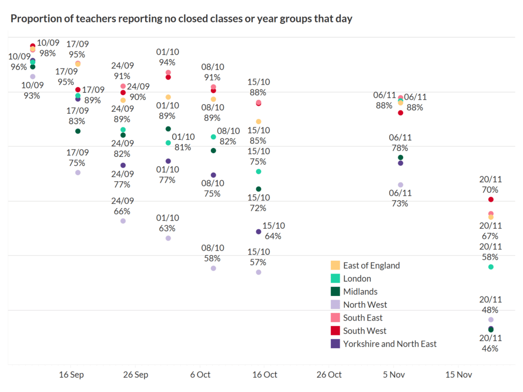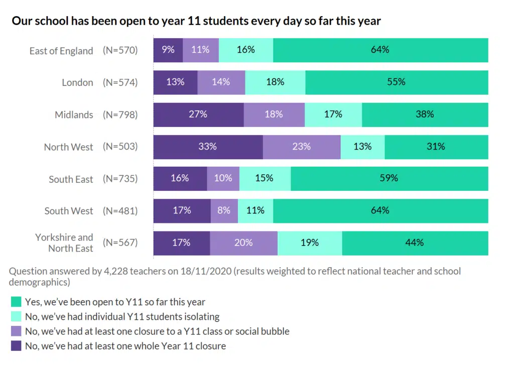 In the East of England and South West, two-thirds of teachers said their school has been open to all Year 11 so far this year. By contrast, this has happened in less than a third of schools in the North West. Indeed, a third of schools in the North West have already closed to the whole of Year 11, and the Midlands aren’t far behind in impact.