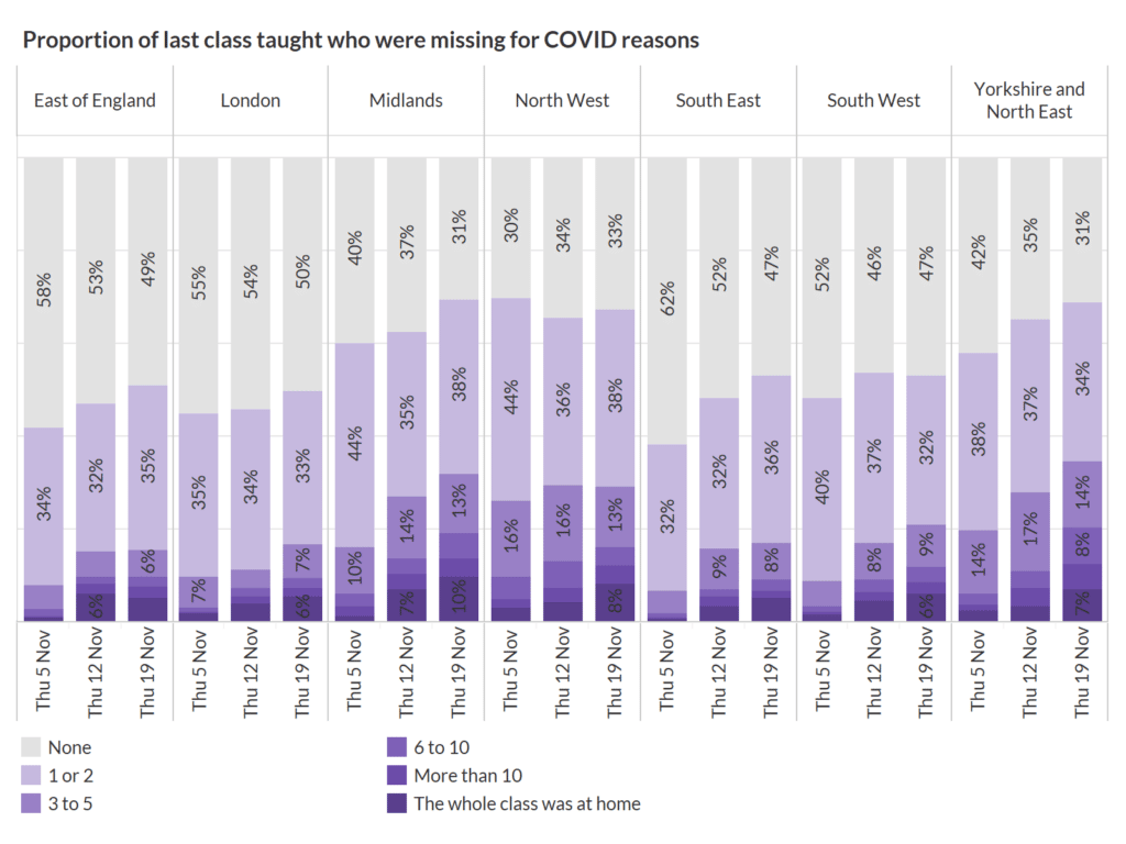 And on our newer measure of disruption, in all regions except for the North West there has been an increase in students missing the class we ask you about each Thursday.