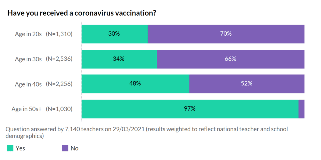 One question you’ve all been desperate to find out, is how many teachers are now vaccinated? The UK’s age-led approach means there’s a huge imbalance in the figures. But several of you said that your school was offered leftover vaccines from nearby hospitals or other programmes, and you wanted to know if others had the same luck.