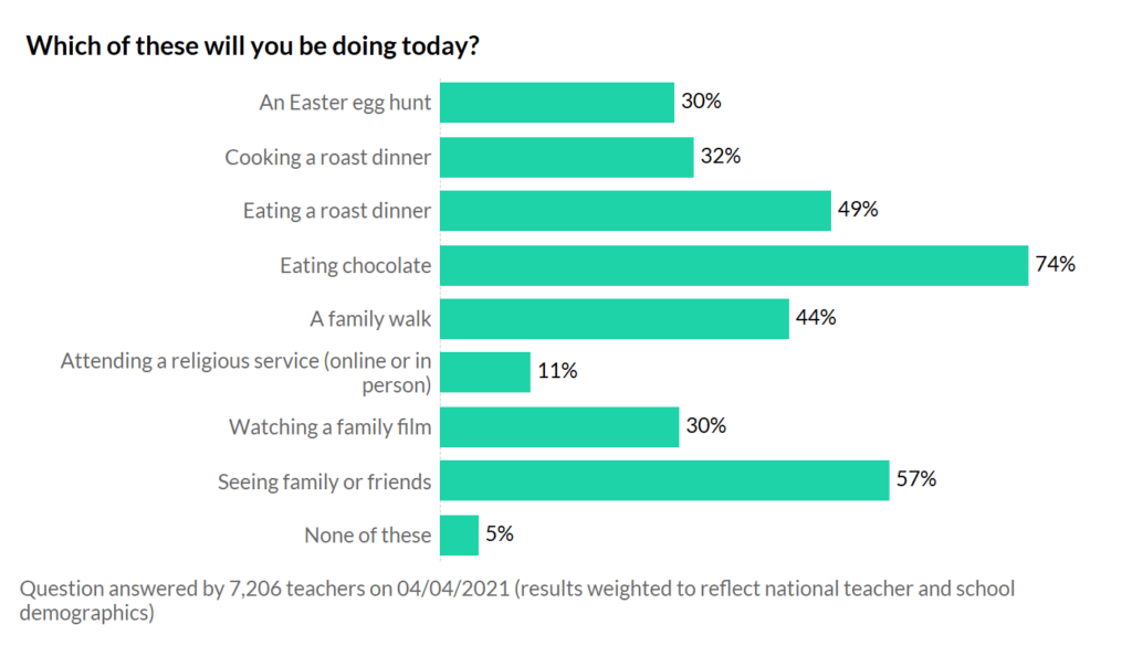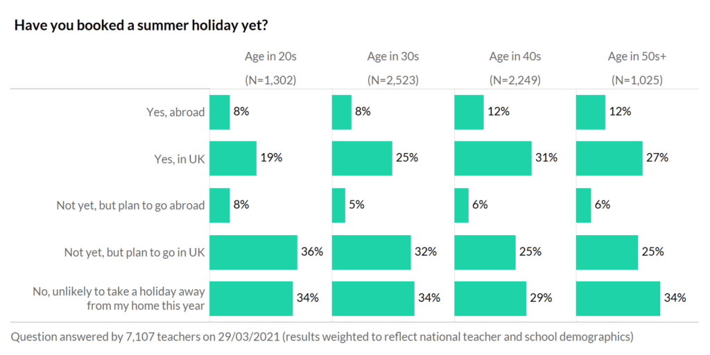 In an ordinary year about 60% of teachers in their 20s go on at least one holiday abroad during the summer, and around 45% of those in other year groups go. Looking at current plans: there’s an age gap reversal! Only 8% of those in their 20s are planning to go abroad, compared to 12% of those in their 40s and 50s. Is this a jab effect?!