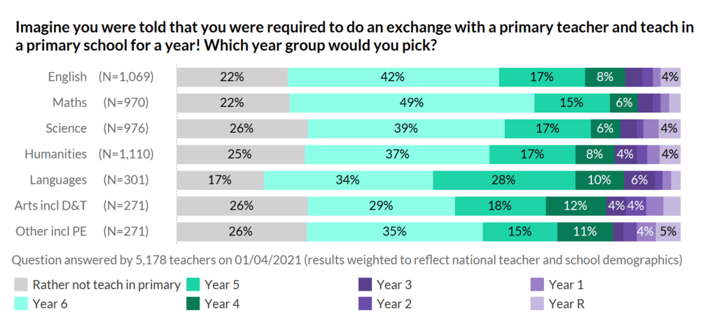Year 6 was overwhelmingly the preference, with Year 5 following behind. Only around 4% of teachers selected reception year, with maths and MFL teachers the least likely to pick the very youngest as their preferred charges!