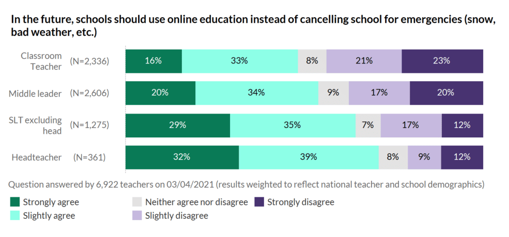 Headteachers and senior leaders were the most positive, with more than half agreeing that online education is a good alternative. Classroom teachers, who are the ones expected to deliver the online lessons, were less keen: 49% up for it, and 44% against.