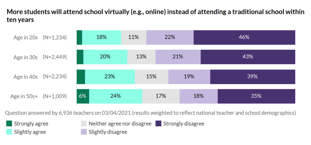 When it comes to virtual schools becoming an alternative to tradition schools, there’s even less appetite. Only a quarter of teachers felt that there would be more students attending virtually in future, and younger teachers were the most sceptical of all. This may come as a surprise given that young people are presumed to be digital natives. Perhaps their familiarity with technology is also why they realise its limitations!