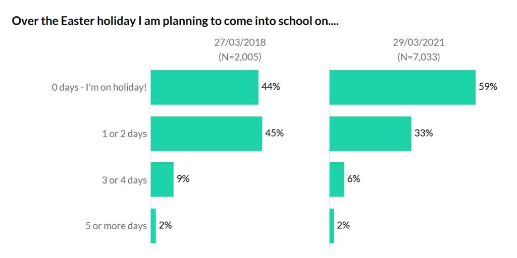 In an ordinary year about 60% of teachers in their 20s go on at least one holiday abroad during the summer, and around 45% of those in other year groups go. Looking at current plans: there’s an age gap reversal! Only 8% of those in their 20s are planning to go abroad, compared to 12% of those in their 40s and 50s. Is this a jab effect?!