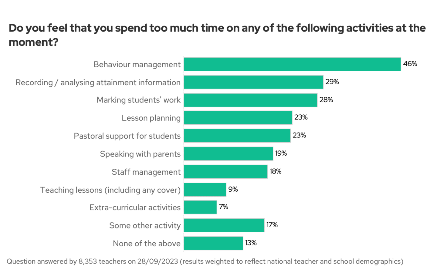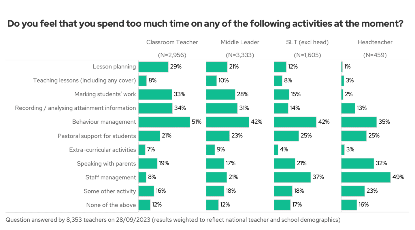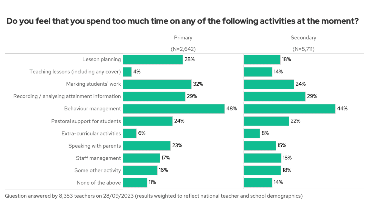 This week, we asked what activities take up too much of your time. Behaviour management came out as the biggest single time sink teachers face: almost half of you feel you’re spending too much time on it. This echoes past findings: almost half of teachers say behaviour has caused them “stress or unhappiness” in the last two weeks – and a quarter say that it’s caused them more stress than anything else at work. Making behaviour management easier, or behaviour better, seems like a good target for leadership action.