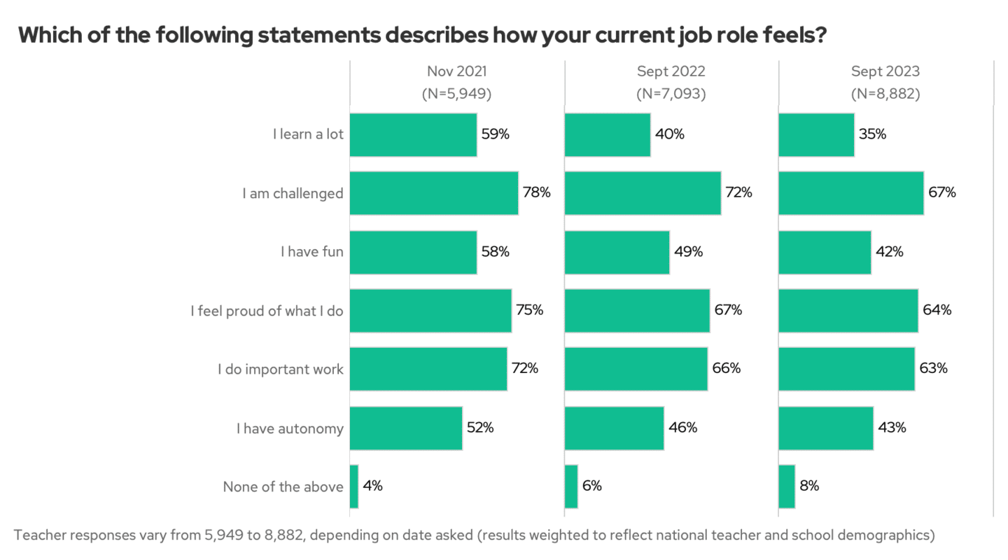 Having asked this three Autumns in a row, we were disappointed to see a clear trend: the proportion of teachers reporting specific positive emotions continues to fall. The biggest drop is in learning: in 2021, 59% of teachers said they learn a lot; in 2023, that’s fallen to 35%. The biggest positive – challenge has remained high, although even that has fallen.