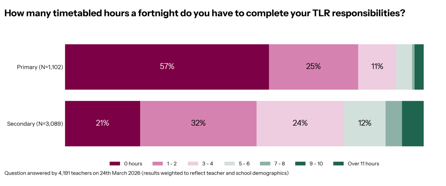 Onto some edu-data analysis! And we’re kicking off with the question that led to the Teacher Tapp inbox filling up with responses: TLR timetable time. Teaching and Learning Responsibilities give classroom teachers an extra payment in their pay packet, but don’t always come with time on the timetable.
