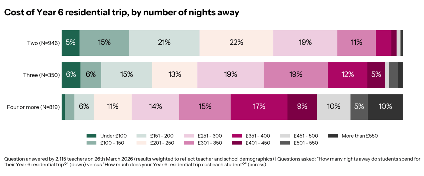 How long the trip lasts varies between state and private: in state schools, a two-night trip is the most common (42%), but in private schools, four nights is the most common (53%).