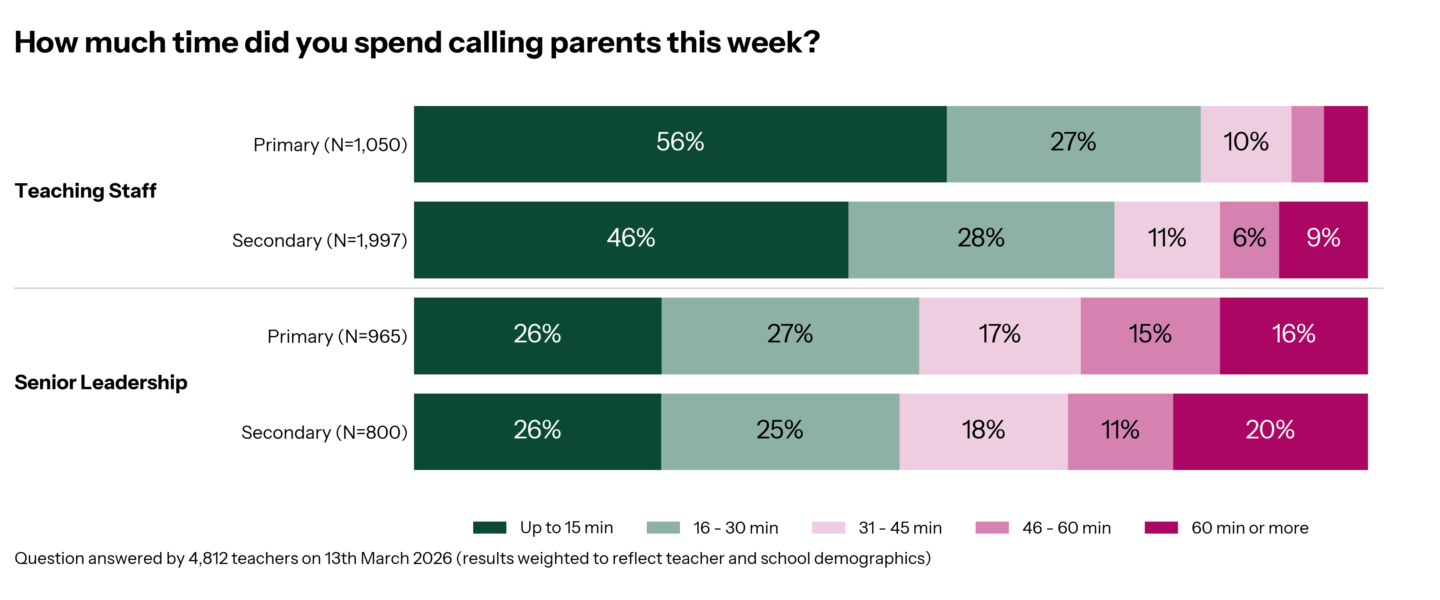 Senior leaders in secondary schools clocked up the most minutes calling parents (20% spent more than an hour), and primary senior leaders weren’t far behind (16% spent more than an hour).