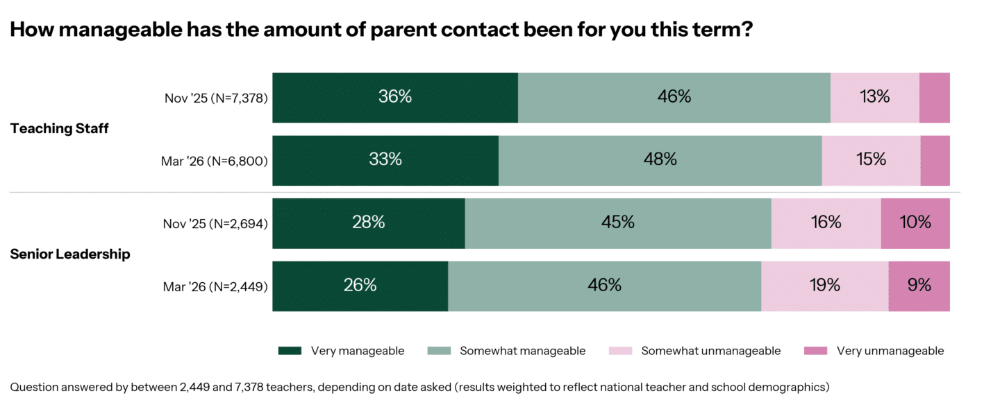 - 📈 Parent contact is getting harder to manage over time — for both teaching staff and senior leaders, the proportion finding it unmanageable crept up between November 2025 and March 2026. It’s a small shift, but a consistent one in the wrong direction! Teaching staff reporting contact is ‘very manageable’ is down to 33% from 36%. Similarly, senior leaders dropped from 28% to 26%.