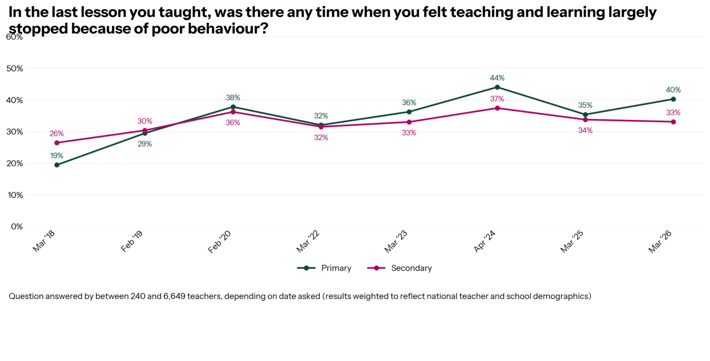 Spring term behaviour looks like secondary is very similar to previous years, but primary classrooms have seen more disruptions compared to last year (40% vs 35%), but not as high as Spring term 2024 (44%).