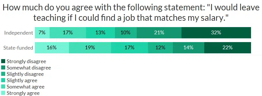 Those of you with less than five of experience are more likely to disagree – chances are your teaching wages isn’t yet high enough to limit outside opportunities. And, intriguingly, those teaching in private schools seem much happier to stay in teaching, regardless of other opportunities available to them.