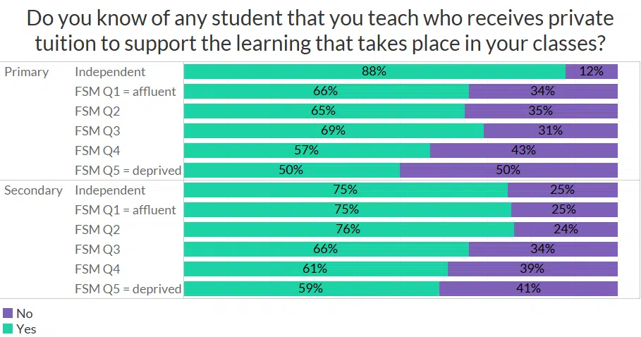 It seems that most of you are teaching at least one student who receives private tuition and there is a social gradient to this. Private sector primary schools report a high incidence of tuition, presumably because so many children are preparing for selective entry to their next school. In state schools, the reported rates of tuition are lowest in schools serving poorer communities.