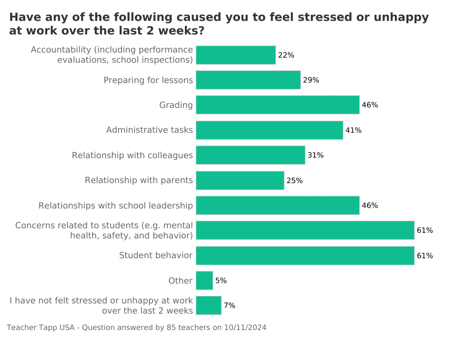 Top of the stress-list is student behaviour and concerns related to students (61%), followed by relationships with school leadership and grading work (46%).