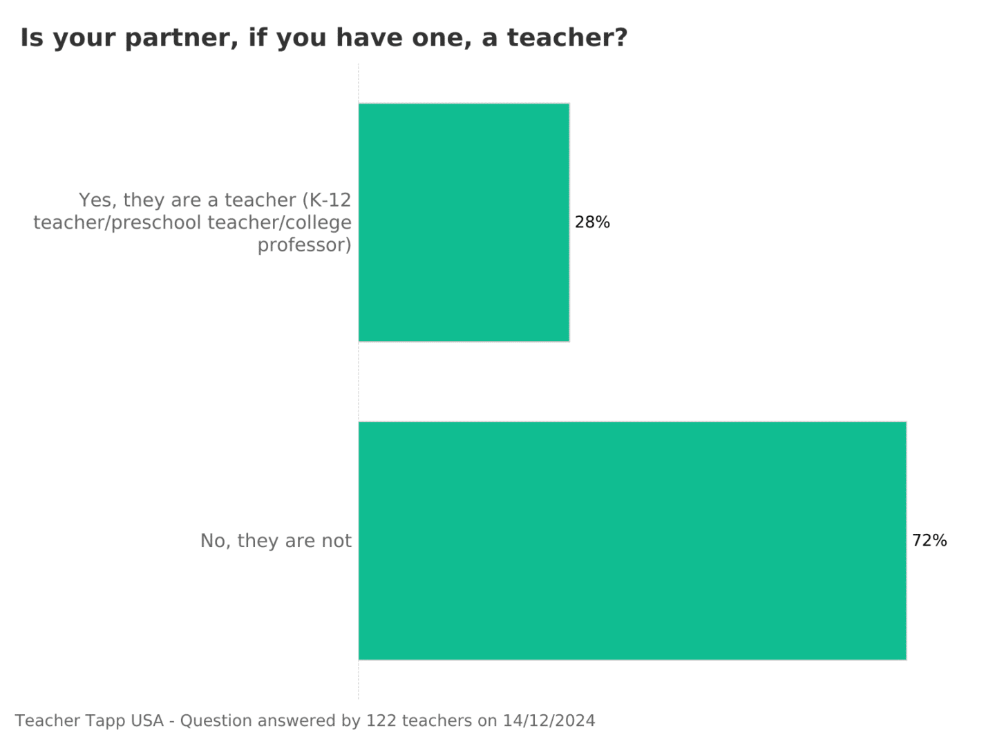 Looking at just those in relationships, 28% are partnered with a teacher, and 72% are not.