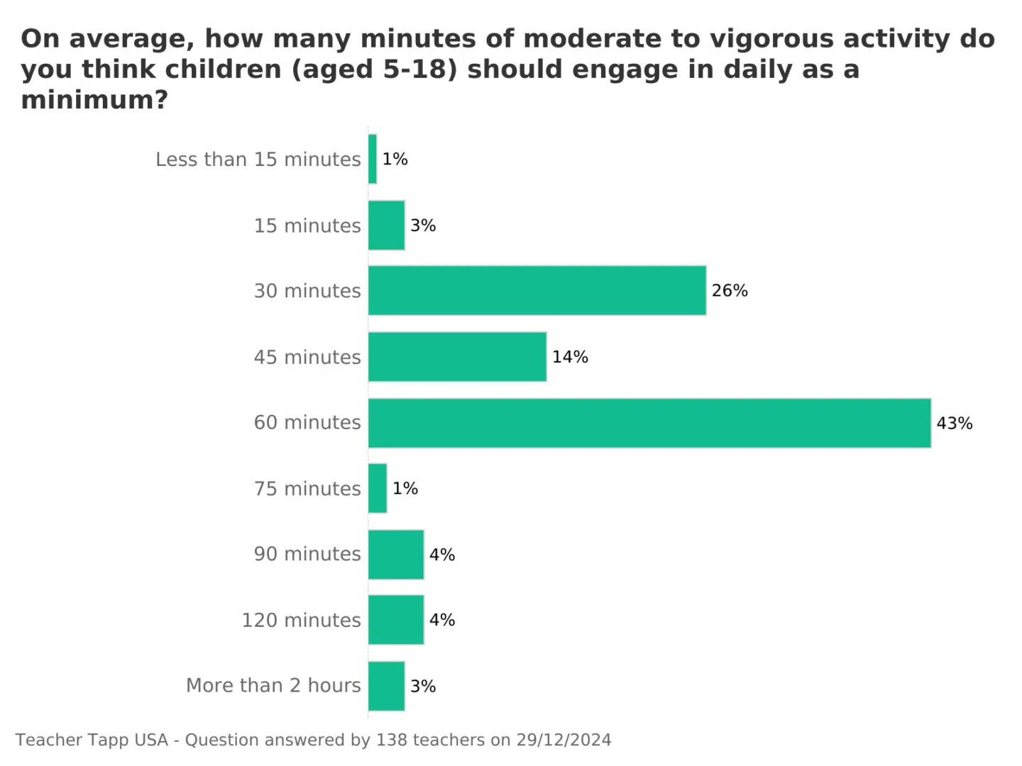 The amount of time children must spend in school exercising and being physically active varies from state to state – almost half of teachers (46%) thought 30 minutes every day of physical activity was recommended to be facilitated by the school.