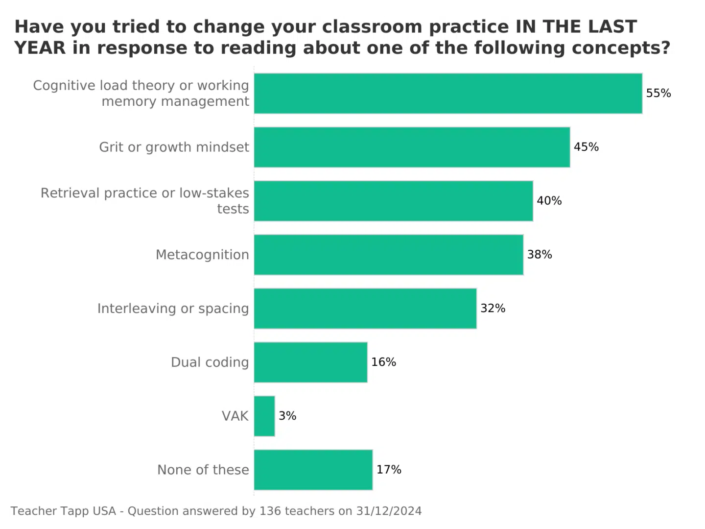 The answer is – a lot! An astonishing 73% of you have made changes to classroom practice as a result of your academic reading. The most common concepts to influence change have been cognitive load theory (55%) and growth mindset (45%).
