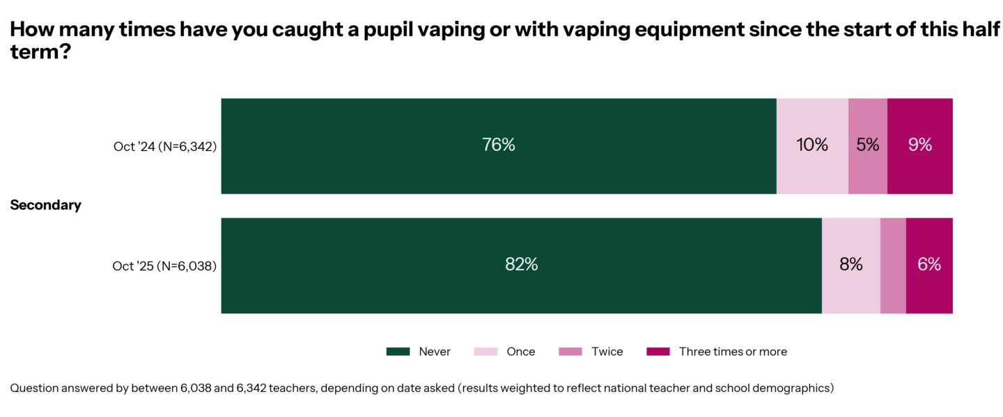 There has been a year-on-year drop in the number of secondary teachers catching students vaping or with vaping equipment. In 2024, 24% caught a student with vaping equipment at least once, whereas in 2025, that figure dropped to 18%.