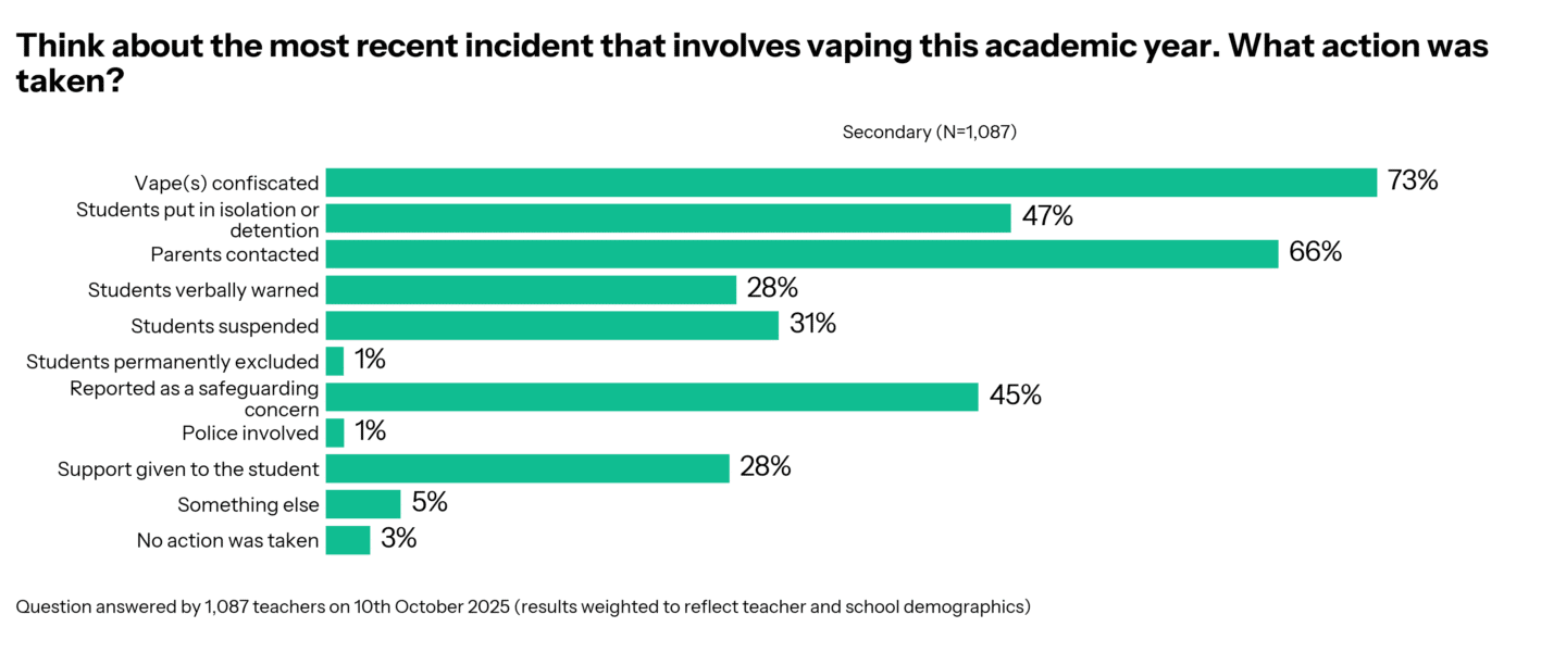 When students are caught vaping or with vaping equipment, the most common actions taken by teachers were to confiscate the vapes (73%) to contact parents (66%) and to put students in isolation or detention (47%).