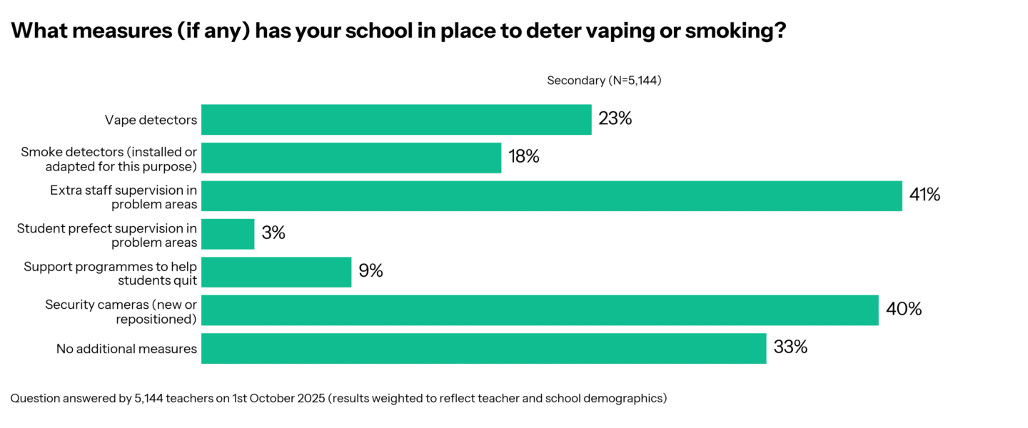 Two-thirds of secondary schools have taken action to deter vaping. The most common steps were to put extra staff in problem areas (41%), install extra security cameras (40%) and install vape detectors (23%).