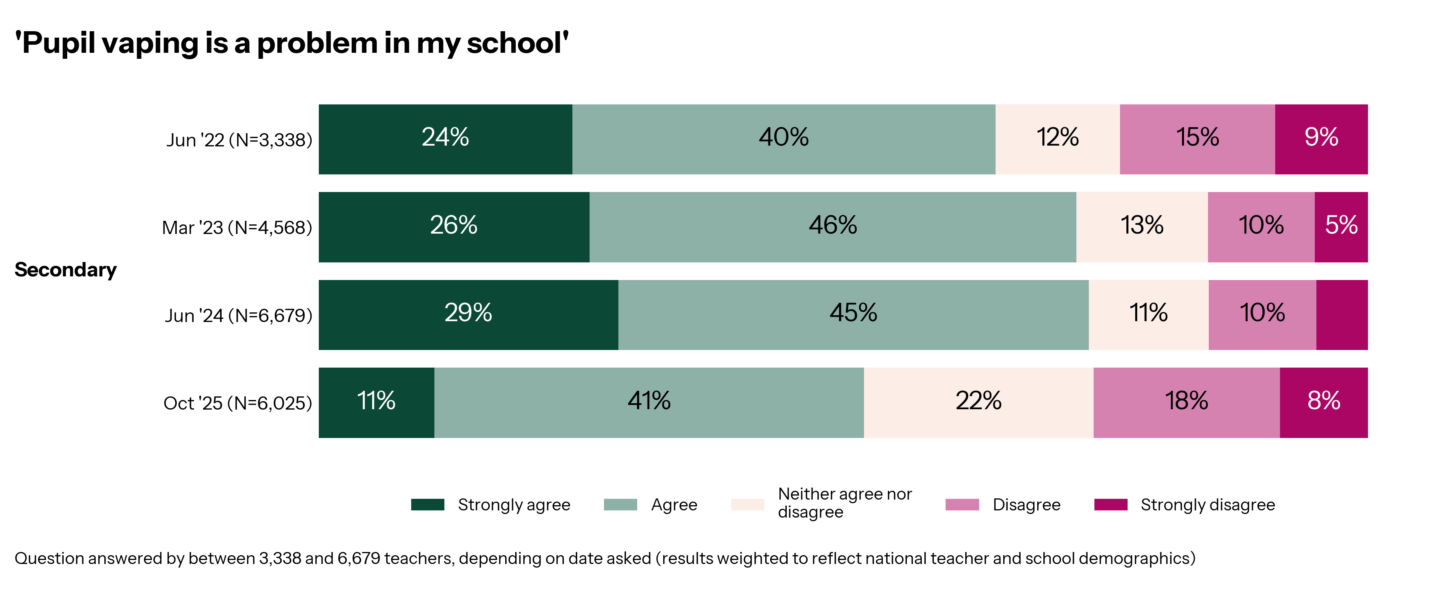 How many teachers feel vaping is a problem in their school? In October 2025, 11% of secondary teachers strongly agreed vaping was a problem in their school, 41% agreed it was a problem, 22% neither agreed nor disagreed, 18% disagreed and 8% strongly disagreed.