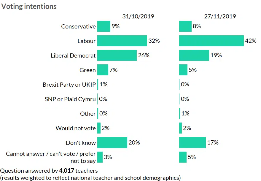 After carefully watching teacher voting plans, we’ve seen a marked change in voting intentions between 31st October and 27th November (we’ve only included people who answered on both dates).