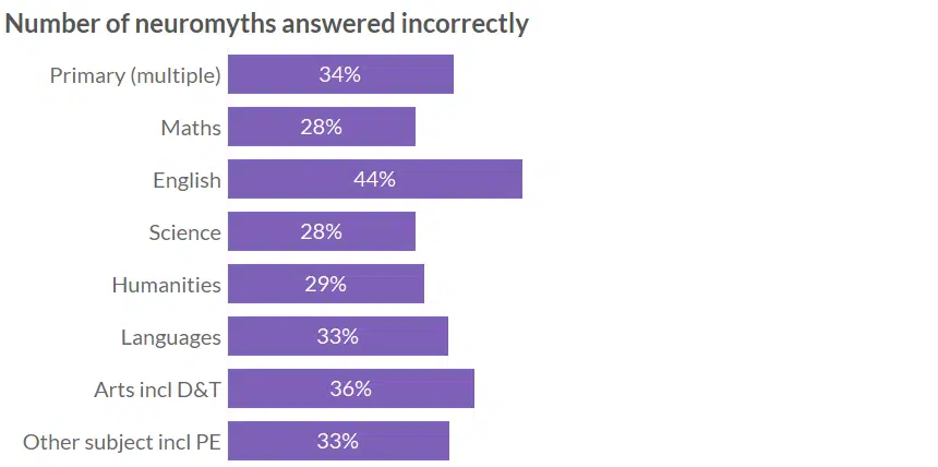 Analysed by subject, science teachers were the least likely to issue an incorrect answer. However, English teachers trailed at the back, which tells us that despite last week’s finding that English teachers read the most educational literature outside of work, they aren’t usually reading about the brain!