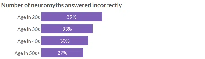 Teachers in their twenties were slightly more likely to answer the neuromyth questions incorrectly – does this mean that teacher training still isn’t up to speed on the latest neuroscience? 😬