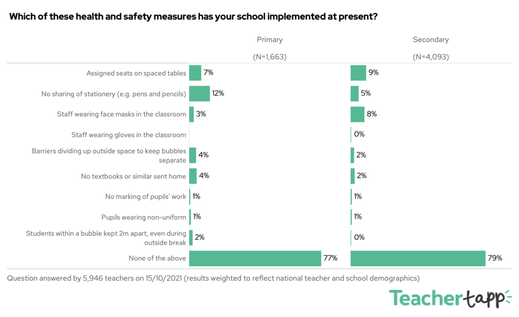 Measures are only slightly different between primary and secondary schools. 12% of primary schools are saying “no” to stationery sharing, compared to just 5% of secondaries. More of you in secondary schools are wearing masks – 8%, when just 3% of your primary colleagues are doing the same.