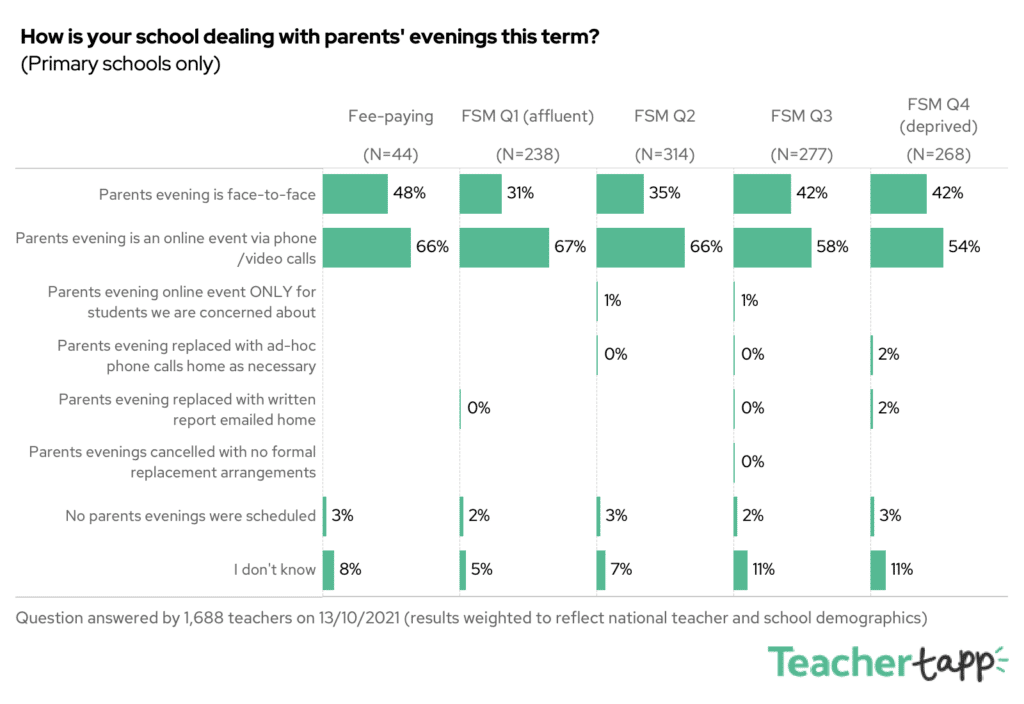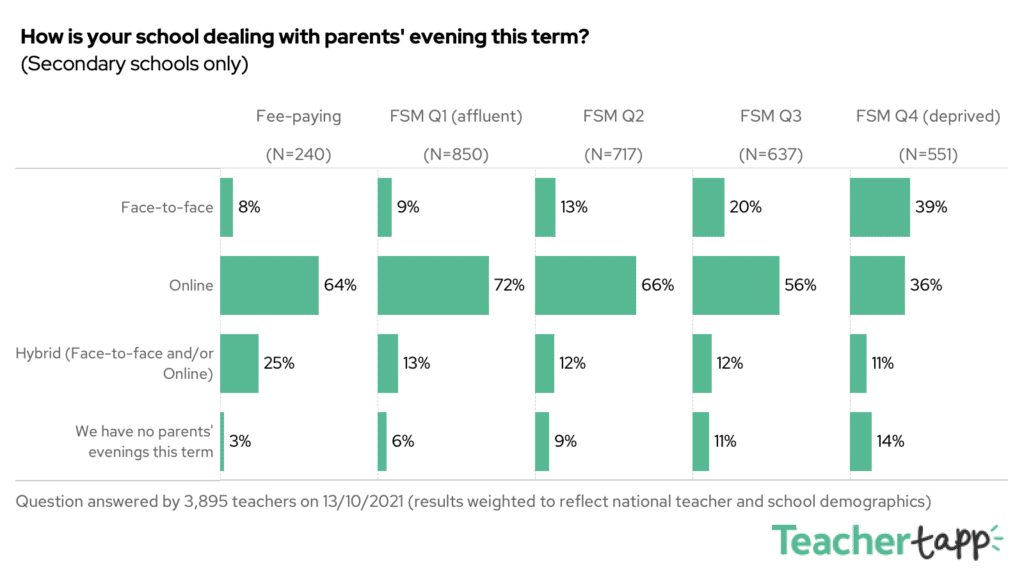 However, secondary schools in less affluent areas are more likely to be hosting a face-to-face parents evenings. While only 9% of the most affluent schools are having parents’ evening in-person, 39% of the most deprived schools are. Fewer families with suitable devices to be able to dial in may be the reason behind moving back to the face-to-face approach.