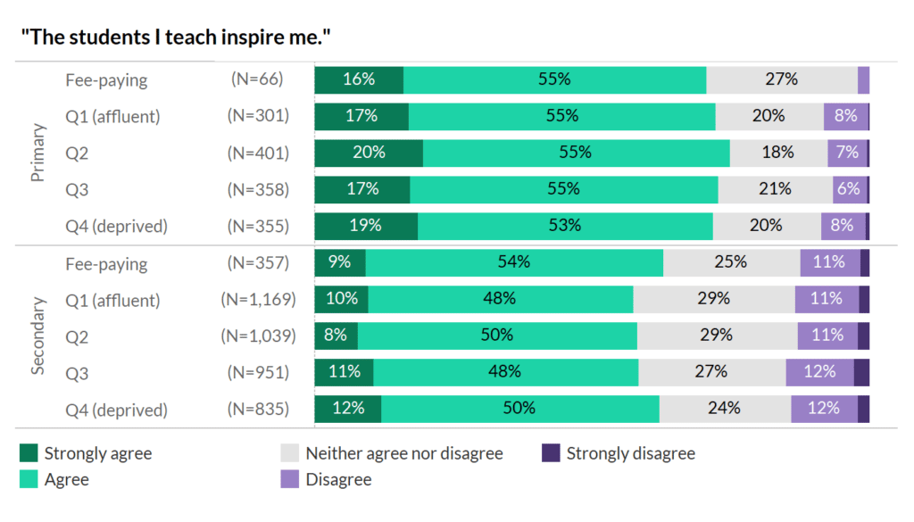 However, when we asked how much the students you teach inspire you there were no differences by social background of the school. And secondary teachers were almost as inspired as primary teachers.
